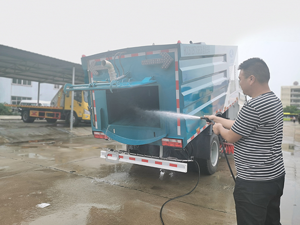 ![]() | 厢体采用倾翻卸料,带高压冲洗自洁装置。垃圾箱自洁装置可在垃圾箱卸料时帮助卸料,冲洗附着在箱体内壁上的残留垃圾。 |