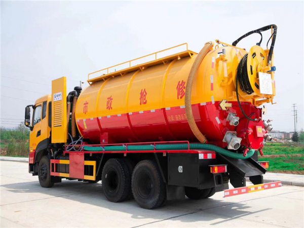 4:后封头可旋转齿轮自动液压绞盘,标配通径22高压管60米,耐压22mpa,后封头下部开600mm内通径液压排污口1个,后盖左下6寸排污阀1个,后盖右下4寸排气阀1个,4寸吸污阀1个,副发进气管用125mm,不锈钢水箱做0.8方,1个工具箱《尽量做大》,防溢流装置,后尾部装双箭头灯,清水罐顶部装排气阀1个,清水罐底部装4寸排水阀1个,出水管在清水罐里面装75mm阀门,出水管用89mm管。