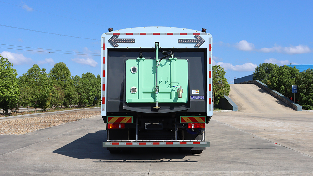 ● 清水箱和垃圾箱分体布置,有效空间利用**化,一次连续作业时间长。同时在作业过程中可通过污水排放装置对污水进行排放,随时加清水继续作业;垃圾箱采用双油缸自卸卸料,箱内同时设有大流量高压喷嘴,可快速冲洗垃圾箱