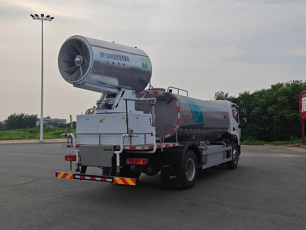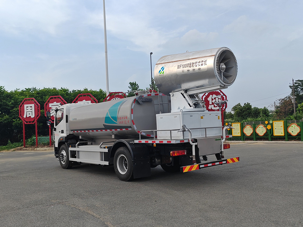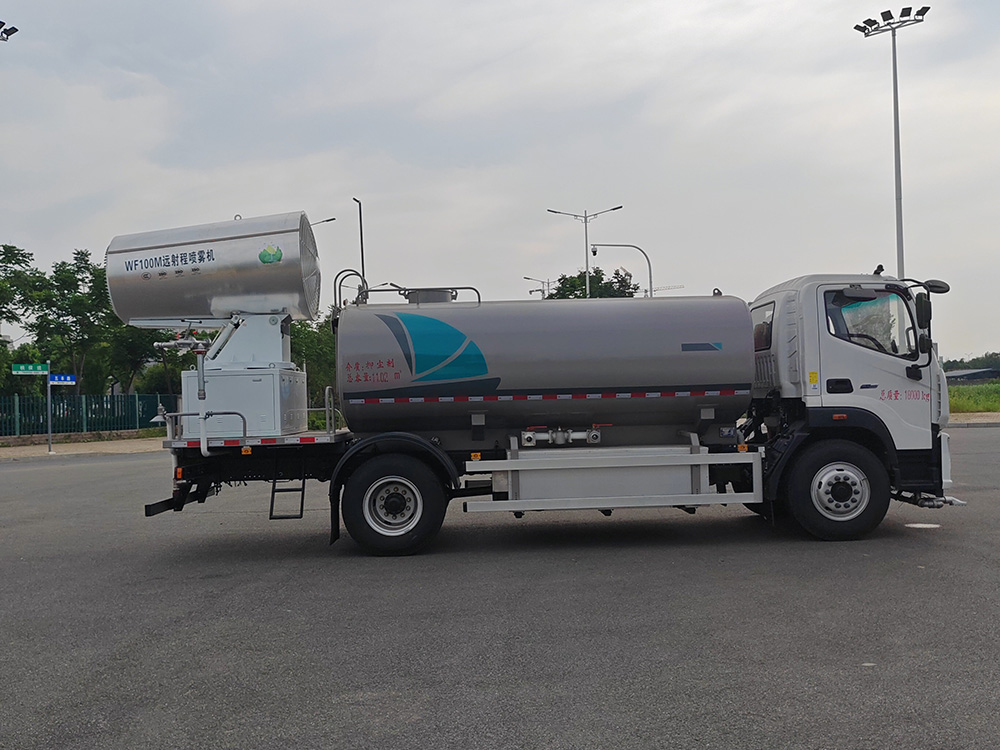 我公司抑尘车标配:前置电动水炮(可 360°旋转,可调成柱状**射程 35 米,也可调成雾状**射程 15 米,(可调成: 直冲状、大雨、中雨、小雨、毛毛雨)、对冲、后洒、侧喷、后置式工作平台、,配备优质大功率专用洒水泵,杂物过滤网,国标通用 65 型消防接口(可通过消防栓加水),2 根引水胶管。水泵、取力器、球阀、滤网均为**标准产品,主管道加粗,法兰垫、法兰盘加厚,前对冲,大通径球阀,具有性能优良,工作可靠、效率高、流量大。尾部加装雾炮能有效的对雾霾、灰尘进行有效的抑制效果。
