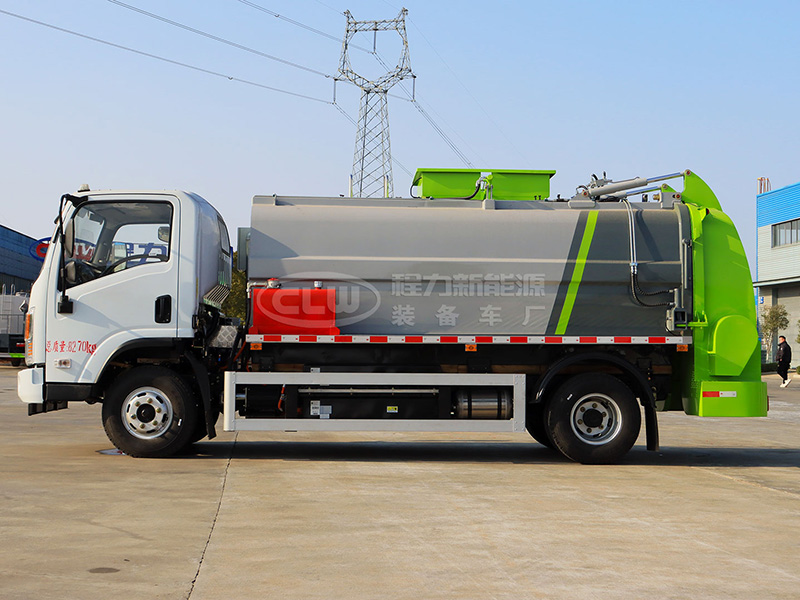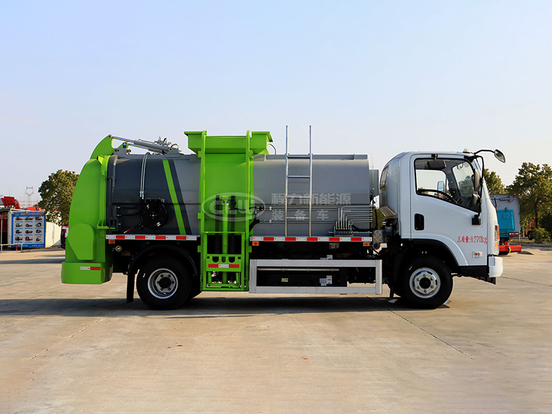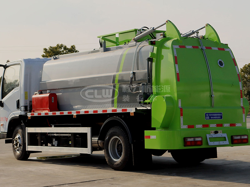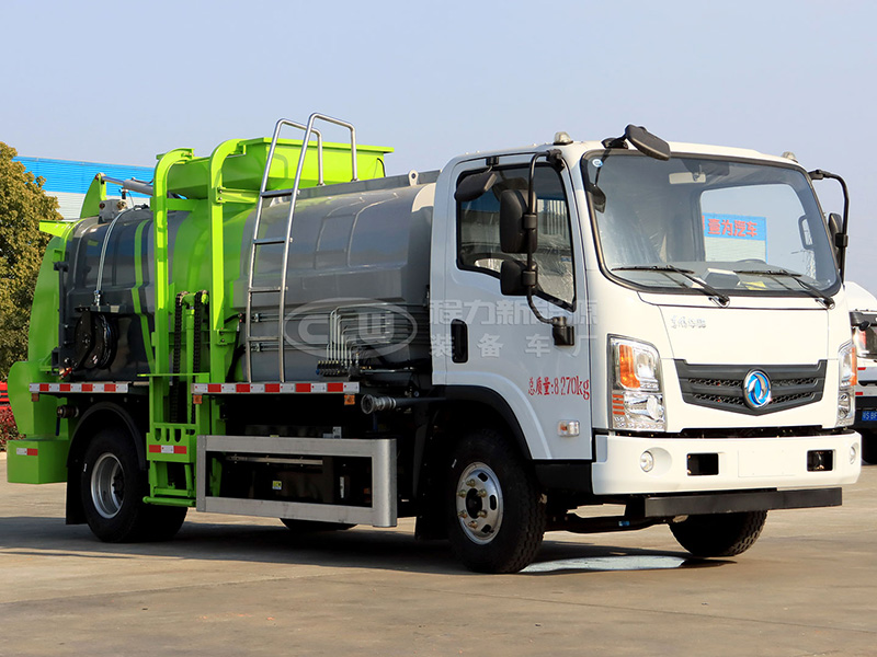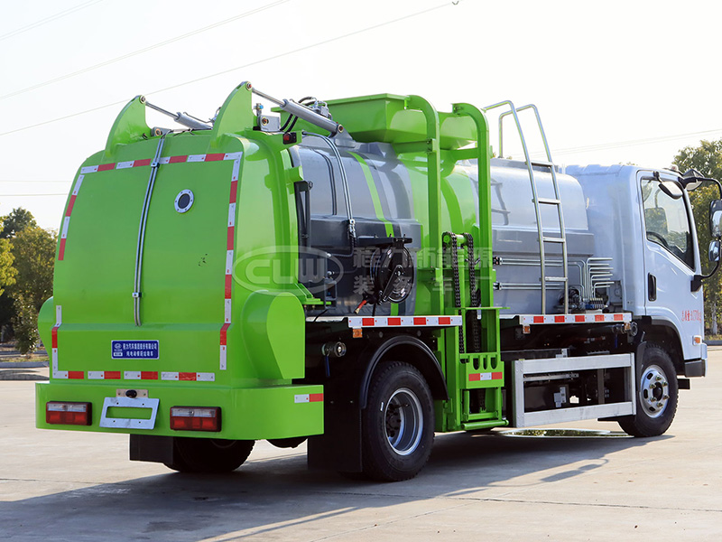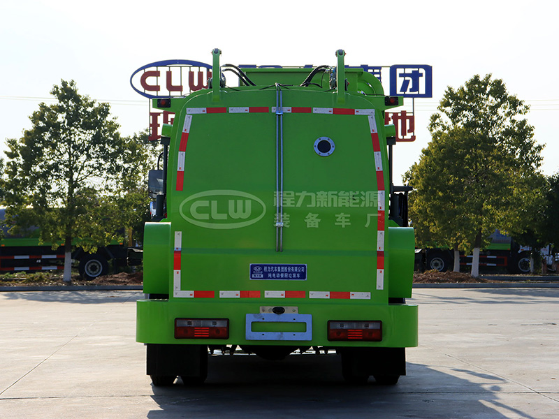 工作原理:整车为全密封型,自行压缩、自行倾倒、压缩过程中的污水全部进入污水箱,彻底的解决了垃圾运输过程中的二次污染,具有压力大、密封性好、操作方便。安全等优点。垃圾箱可实现箱内餐厨垃圾固液的初步分离,并采用大容积污水箱,提高产品装载量; 电控系统采用无线遥控,并通过作业动作逻辑互锁,保证操作的精准性,杜绝误操作。