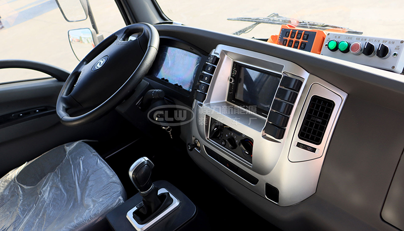 (4) 人性化的操作**;作业操控分别配置中控屏和无线遥控器,驾驶室内的中控屏可**所有作业操作,并且监控接近开关、 传感器信号状态;上装故障代码显示;上装电机、电控电参数监控和显示等功能;